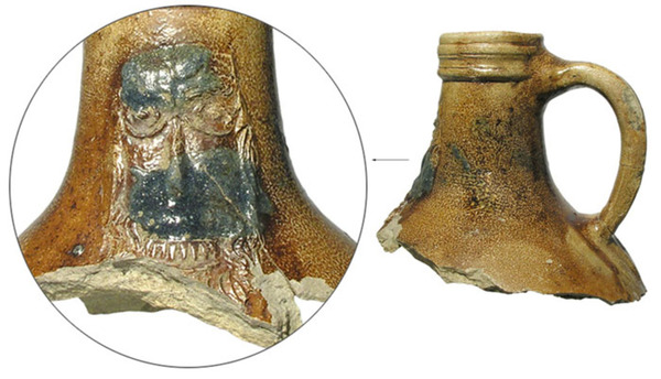 | 5c decoratie | appliques: baardmanmasker, kobaltblauw ter plaatse van de applique blauw |