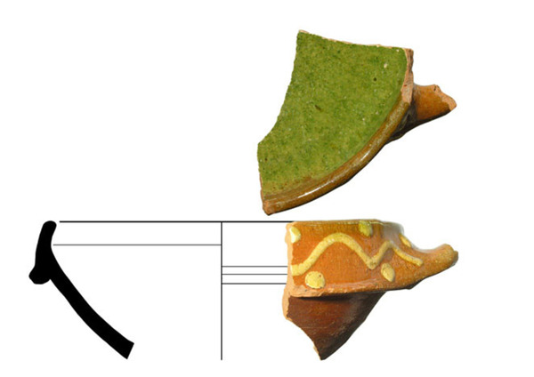 | 5c | inwendig witte sliblaag, ringeloorversiering op buitenzijde rand: golflijn met stippen |