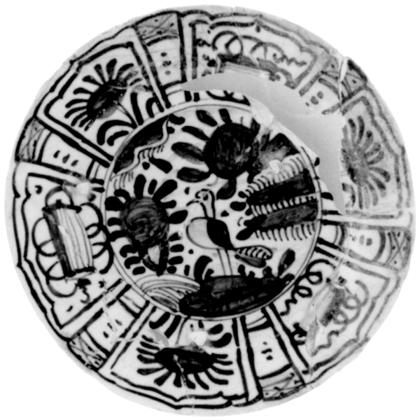 | 5c decoratie | inwendig: imitatie Wan-Li (vogel in landschap); uitwendig: zes vlakken met cirkels decoratie in blauw |