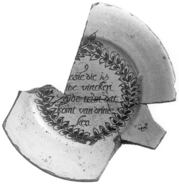 | 5c | spiegel: "SIE DIE IS .IE DE VINCKEN ZEYDE TEUN DAT KOMT VAN DRINCKEN" blauw |