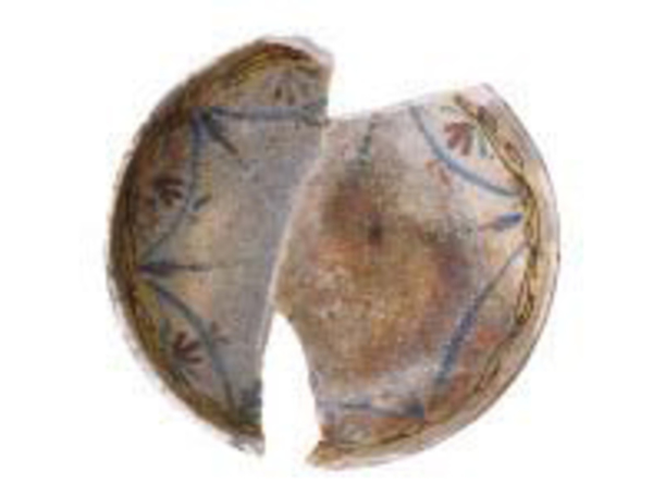| 5c decoratie | geel, bruin, groen, blauw, rood: planten, bogen en stippen polychroom |