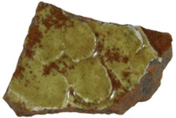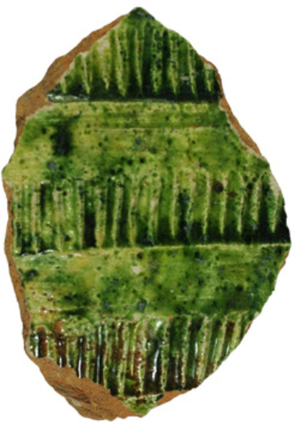 | 5c | radstempel, sliblagen, snij- en stempelwerk, oplegwerk (o.a. 'rattenstaarten' en 'schubben'), één scherf met koperoxide glazuur |