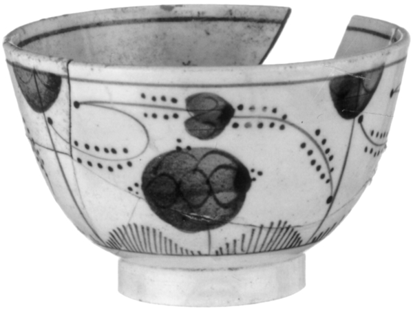 | 5c | uitwendig: onderglazuur: drie panelen met strobloemen in blauw onderglazuur blauw |