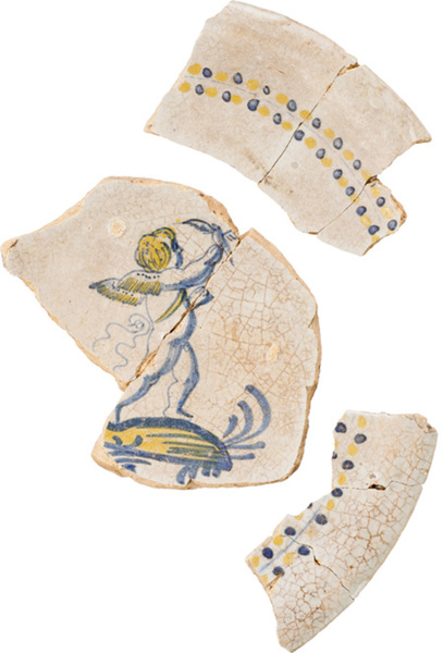 | 5c | blauw en geel beschilderd: cherubijn met vogel binnen cirkel van gele en blauwe stippen (compendiario-stijl) inwendig: polychroom |