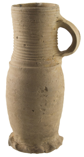 | 4b | lage slanke bekervormige kan met kraag op halsaanzet en rechte rand, op standring |