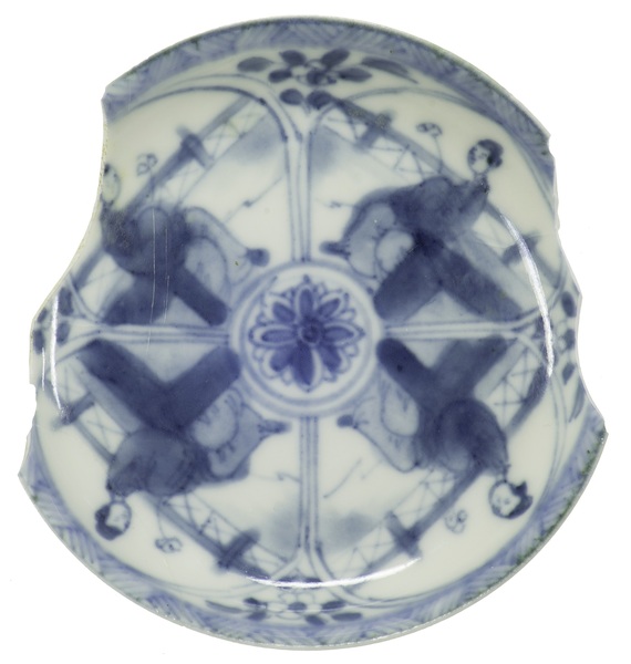 | 5c decoratie | onderglazuur blauw beschilderd: vier vakken met vrouw met bloem in tuin onderglazuur blauw |
