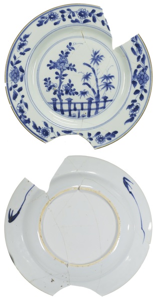 | 5c | bruine rand, blauw beschilderd: bloemen met tuinhek onderglazuur blauw, bruin |