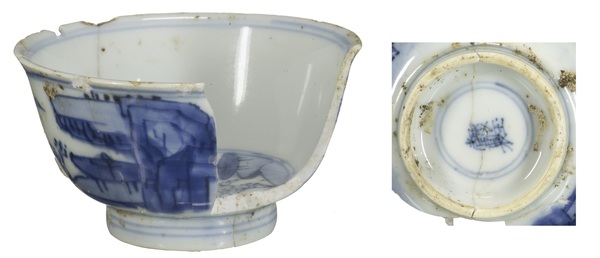 | 5c | blauw beschilderd: man op paard en lopende man en boot in landschap, inwendig: berglandschap onderglazuur blauw |