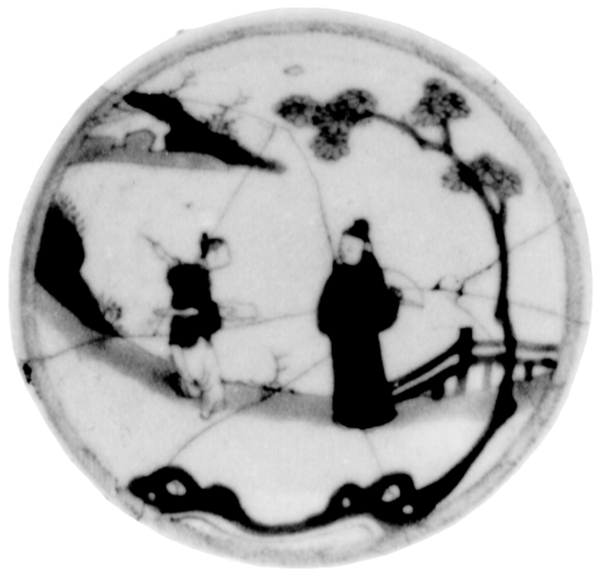 | 5c decoratie | inwendig: onderglazuur blauw: twee personen in landschap onderglazuur blauw |