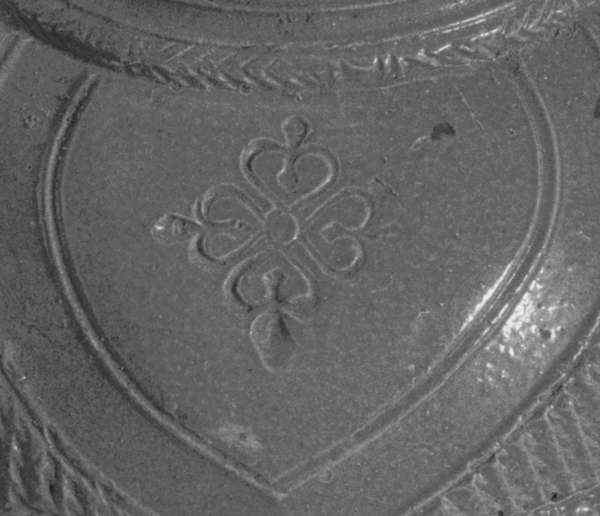 | 5c decoratie | op schouder bladvormige panelen met wafel en vierpas hartvormige bloemstempels |