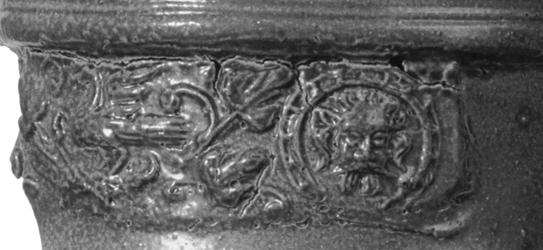 | 5c decoratie | op schouder bladvormige panelen met vierkant bloemstempel, tandenrij op buik, op hals band met medaillon en bladwerk |