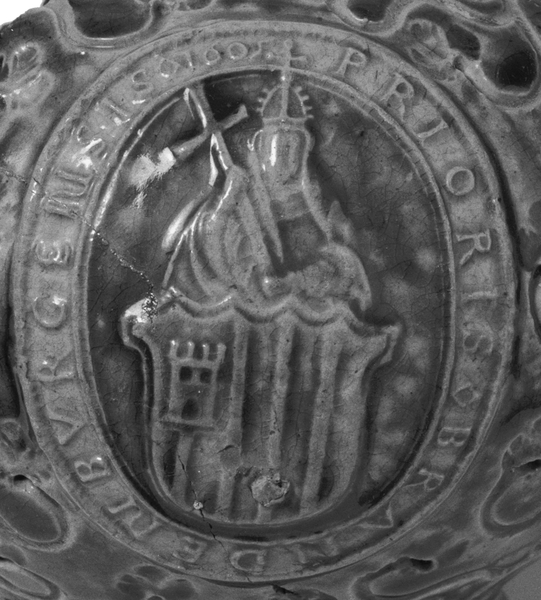 | 5c decoratie | floraal ornament met kronkelende takken, medaillon met wapen, tekst: 'PRIORIS BRANDENBURGENSIS 1605' blauw |