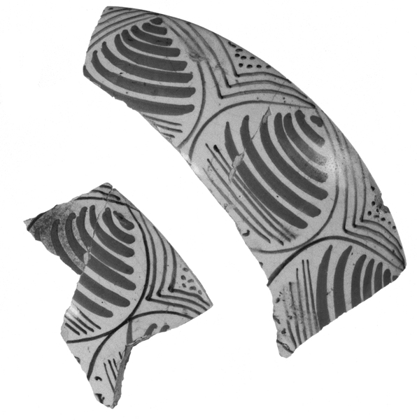 | 5c decoratie | inw. vlag: bruine schubben, rode en gele blokjes, onderkant: verenmotief in ovalen polychroom |