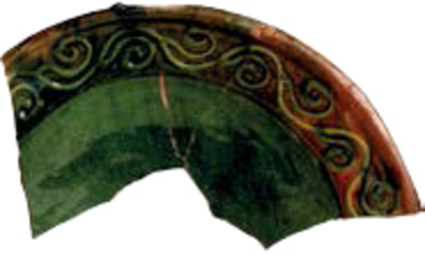 | 5c decoratie | witte sliblaag met groen glazuur op spiegel, witte ringeloorversiering op vlag (golflijn met spiralen) |