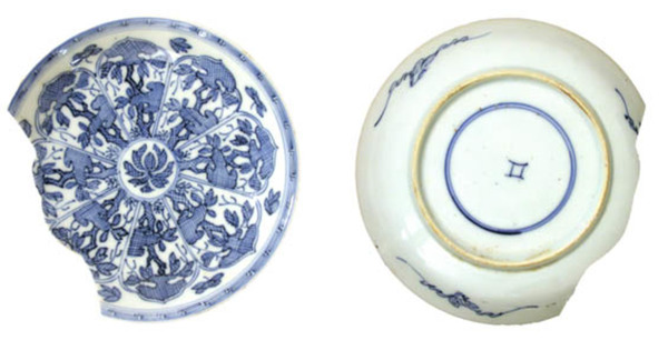 | 5c | spiegel: vakkenverdeling met accoladerand, vegetaal motief; vlag: meanderrand; vlag-achter: vegetale elementen; spiegel-achter: concentrische cirkels onderglazuur blauw |