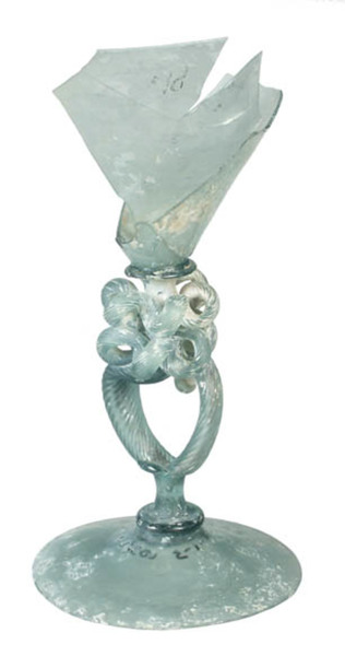| 4b | trechtervormig of meerzijdig kelkglas met een slangenknoopstam die bestaat uit geribde holle draden in een hartvorm die naar boven toe recht gaat met daaromheen enkele gekrulde windingen, ook gecombineerd met blauwe draadversiering, schijfvormige voet met pontilmerk |