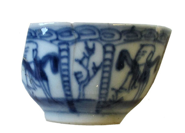 | 5c | buitenzijde: vakken met zotjes en prunustakjes, ornamentband onderlangs rand; inwendig: zotje op bodem en band met servetwerk onderlangs rand onderglazuur blauw |