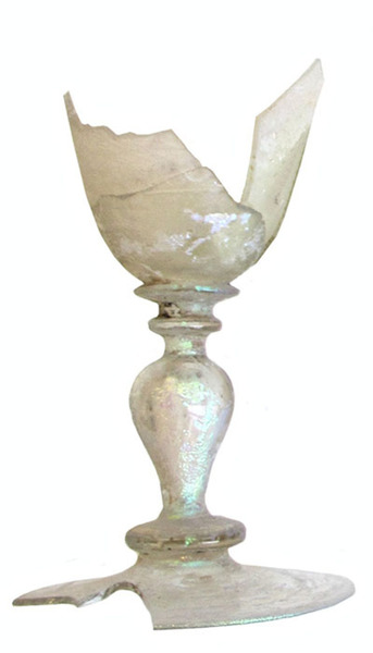 | 5d diversen | witte irisatie (kleurige reflecties), holle balusterstam met onderaan 1 en bovenaan 2 schijfjes, conische kelk, vóór 1650 i.v.m. rechte voetrand |