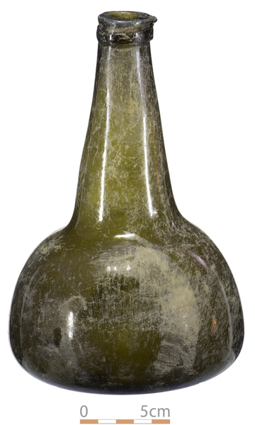 | 4b | bolvormige wijnfles met lange conische hals en uitgezakte buik met grootste breedte aan de basis, conisch opgestoken bodem met pontilmerk |