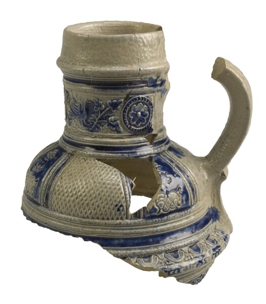 | 5c decoratie | uitw: wand: verticale cannelures; geometrisch versierde cordon; schouder: panelen met afwisselend gutswerk of florale stempels; hals: appliques van bloemen en vogels uitw: blauw krul bij ooraanzet |
