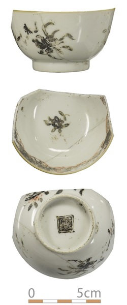 | 5c decoratie | bovenglazuur beschilderd (rood, goud): floraal Kakiemon-stijl, ijzerengobe op rand |