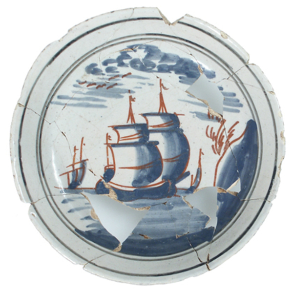 | 5c | inw: onderglazuur blauw en bovenglazuur rood: zeilschepen polychroom |