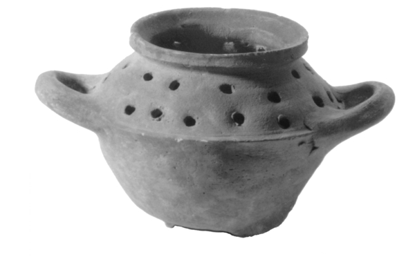 | 4b | bol komfoor met scherpe buikknik en kleine kraagrand met dekselgeul, geperforeerde schouder, lobvoeten (vuurtest?) |