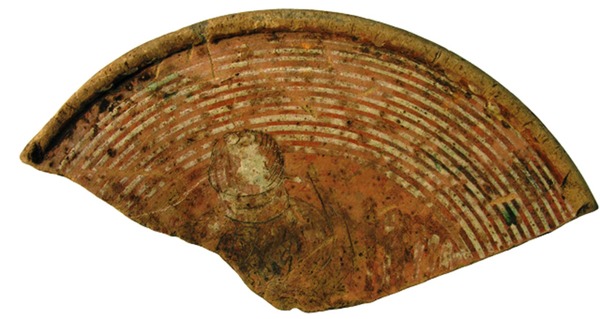 | 5c | bovenzijde slibversiering, koperoxide spiegel: eikel, vlag: concentrische cirkels |