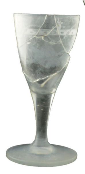 | 4b | toegebogen trechter- of eivormig kelkglas met dikwandige bodem overgaand in rechte massieve stam, ook met luchtbel of spiraalvormige draadversiering, schijfvormige voet met pontilmerk |