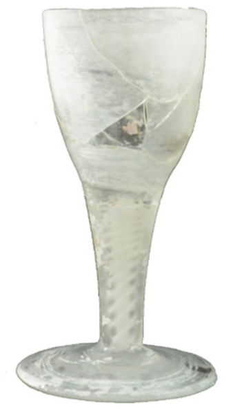 | 4b vorm | toegebogen trechter- of eivormig kelkglas met dikwandige bodem overgaand in rechte massieve stam, ook met luchtbel of spiraalvormige draadversiering, schijfvormige voet met pontilmerk |