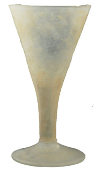 | 4b | trechtervormig glas met dikwandige bodem vloeiend overgaand in massieve rechte stam met afgeronde verticale facetten, schijfvormige voet met pontilmerk |