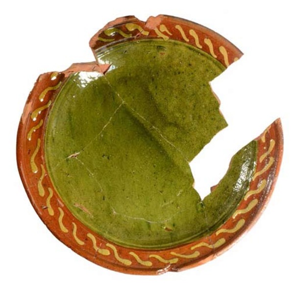 | 5c | bovenzijde spiegel: witte slib en loodglazuur met koperoxide bovenzijde vlag: loodglazuur |