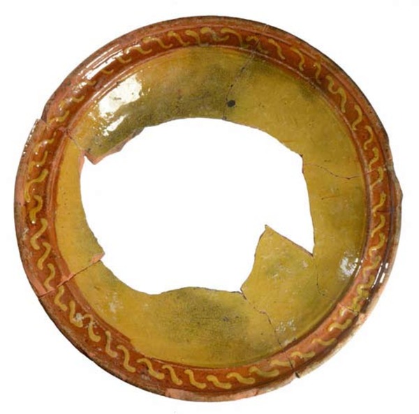 | 5c | bovenzijde spiegel: witte slib en loodglazuur bovenzijde vlag: loodglazuur met ringeloorboogjes in witte slib |
