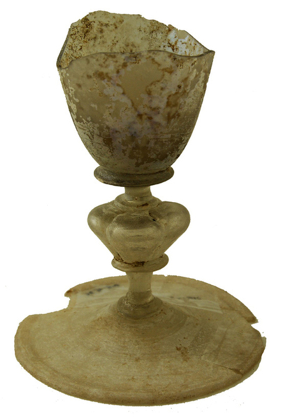 | 4b | trechtervormig kelkglas met of zonder afgeronde of dikwandige bodem, met vierlobbige holle nodus- of balusterstam, met één of meer schijfjes, schijfvormige voet met pontilmerk |