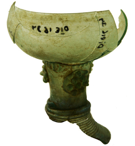 | 4b | roemer met korte brede toegebogen cuppa, geribde draad op de overgang naar de schacht en één of meer verspringende rijen braamnoppen, opgestoken bodem, gewonden draadvoet |