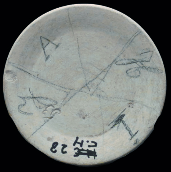 | 5d | verschillende decorletters in potlood op bodem, vergelijk cat. 37 en 41, ingekrast in bodem nr. 53 x vaas of coupe N.V. Faience- en Tegelfabriek 'Holland' |