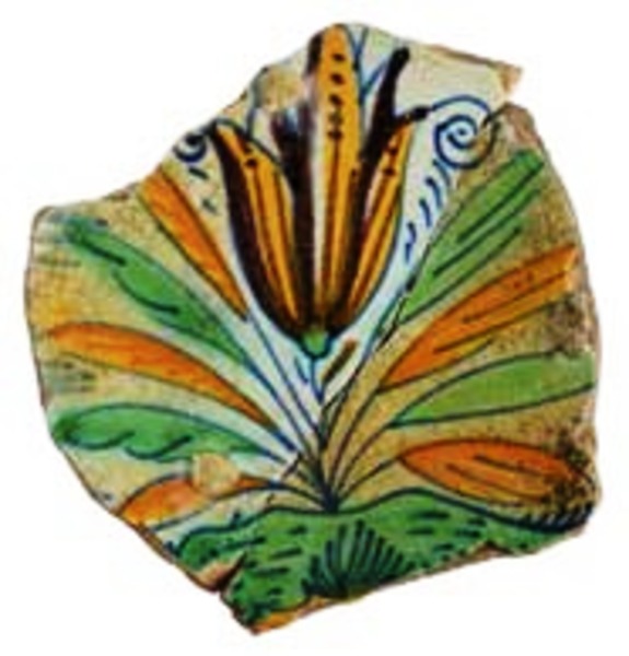| 5c decoratie | beschildering in blauw, groen, oranje, geel en paars; tulp op grondje |