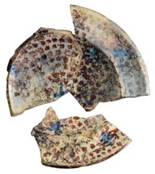 | 5c decoratie | goudluster beschildering; spiegel en vlag: stippen en blauwe bloemen; onderzijde wand: concentrische cirkels |