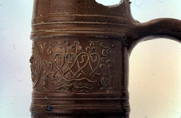| 5c | uitw: drie grote ronde appliques met centraal signatuur “BM ANNO 1575”: (1) apostel Paulus met rondschrift “SENT PAULUS EIN APOSTEL DES HEREN”, (2) apostel Petrus met rondschrift “SENT PETER EIN APOSTEL DES HEREN”, (3) Jezus met rondschrift “JESUS NASE[... KO]NNICK DER IUDEN ANNO 1575”; hals: appliques en opschrift “IESUS, 1576, G E” |