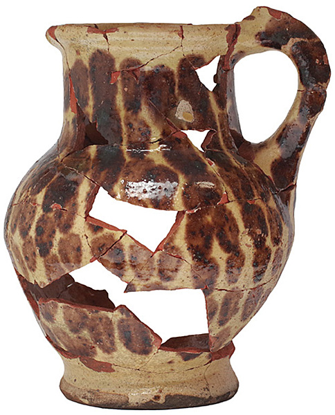 | 5b afwerking (kleur/glazuur) | loodglazuur, uitwendig met ijzeroxide of mangaanoxide vlekken |