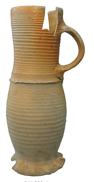 | 4b | lage slanke bekervormige kan met kraag op halsaanzet en rechte rand, op standring |
