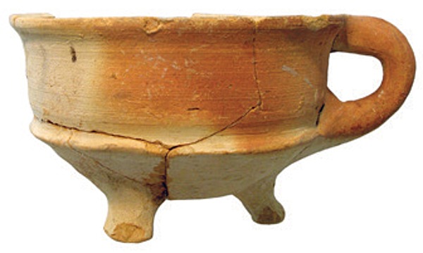 | 4b | ronde vuurtest met scherpe knik bodem-wand en rand met aan bovenzijde een geultje, poten |