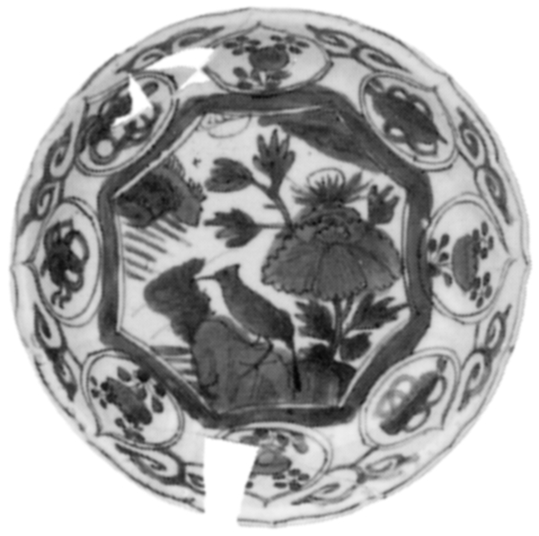 | 5c | inwendig: blauwe beschildering: vogel op rots met omlijsting in Wan-Li-stijl; uitwendig: blauwe beschildering: vijfpunts-rozetten onderglazuur blauw |