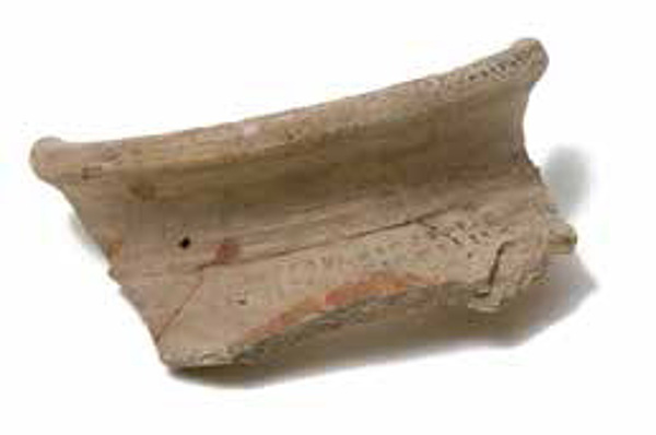 | 5c decoratie | op rand en schouder banden met radstempelindrukken en willekeurige oranje/bruine verfstrepen |
