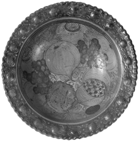 | 5c | vlag: reliëf met dellen en kartelrand; spiegel: fruit "Italiaans-Hollands" inwendig: polychroom |