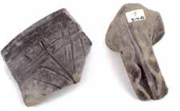 | 5c | op rand/wandfragment ingekraste horizontale en diagonale lijnen, gevouwen worstoor, met ingedrukt golfpatroon |