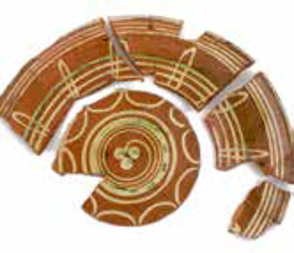 | 5c decoratie | slibversiering: witte rand, decoratie in wit, geel en groen: cirkels en slingerpatroon; in het midden van de spiegel drie stippen |