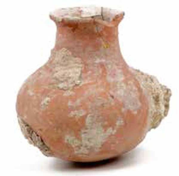 | 5d diversen | hals opening 7.5cm Ø, 1436 is bouwjaar kerk; steunbeer met opening naar buiten, ingemetseld in de kerkruimte voor een betere akoestiek; cementresten en witkalk op en in pot |