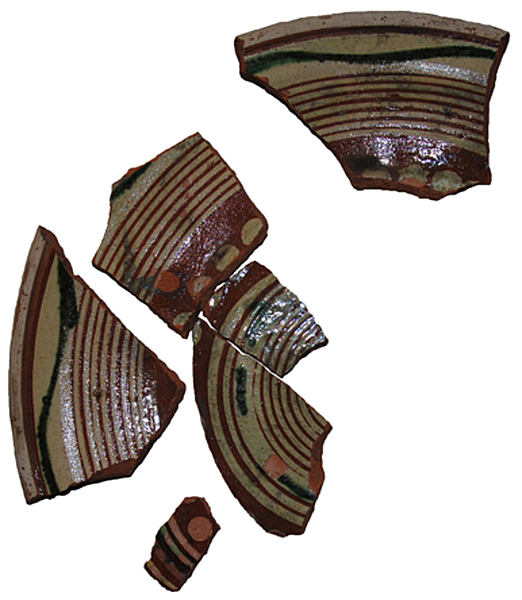 | 5c | slibdecoratie: concentrische banden op spiegel, vlag en rand; stippen op overgang spiegel/vlag; golfband van koperoxide op vlag koperoxide |
