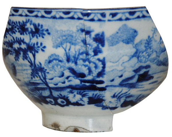 | 5c | transferprint blauw op wit: inwendig bloemen op bodem en rand; uitwendig romantisch landschapje blauw |